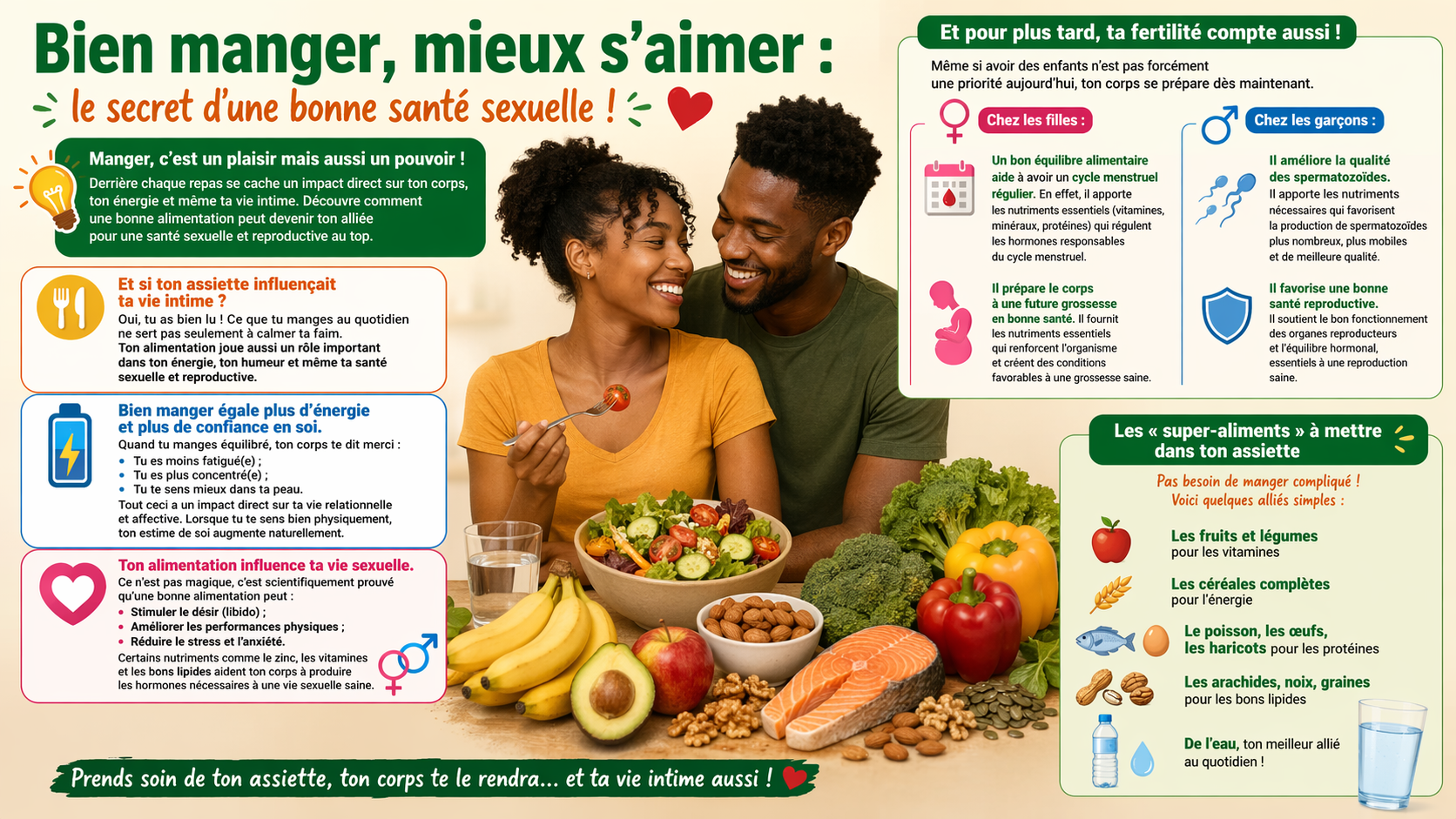 En définitive, bien manger, ce n’est pas seulement pour grandir ou être en forme. C’est aussi essentiel pour une vie sexuelle saine, épanouie et responsable.
